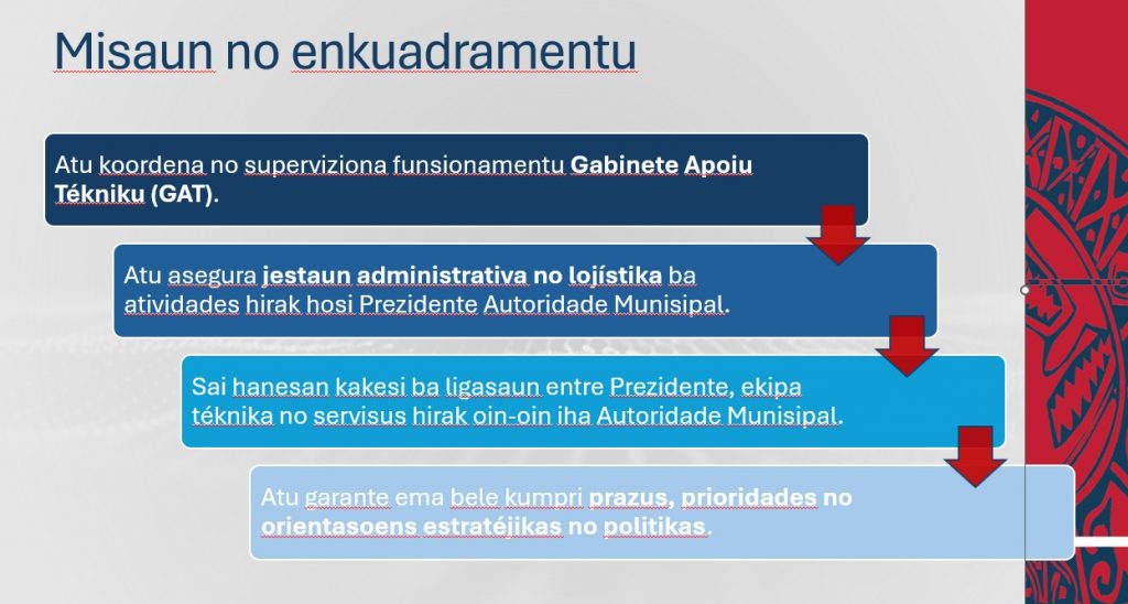 •Misaun: Fo apoiu tékniku, protokolar, administrativu no lojístiku ba Prezidente Autoridade Munisipal