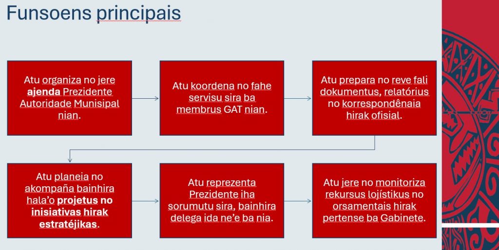 •Sai knar Gabinete Apoiu Tékniku nian atu asegura hala’o servisu hirak ho karáter organizativu, tékniku ka protokolar hodi apoiu Prezidente Autoridade Munisipal.