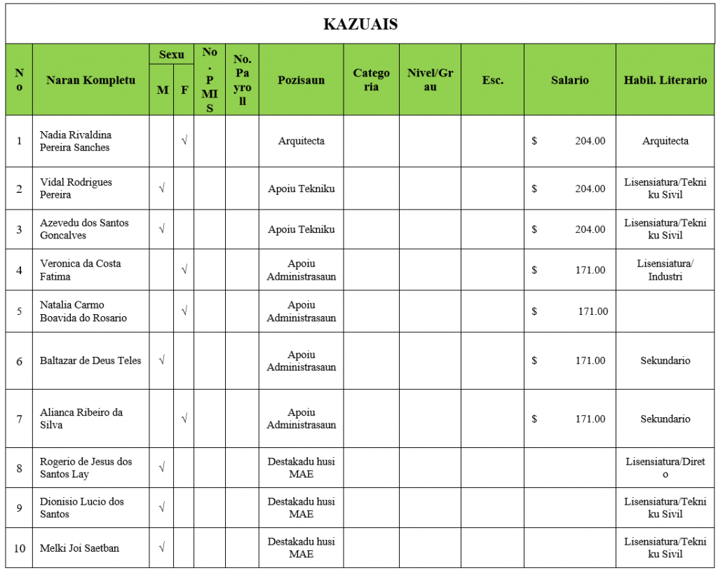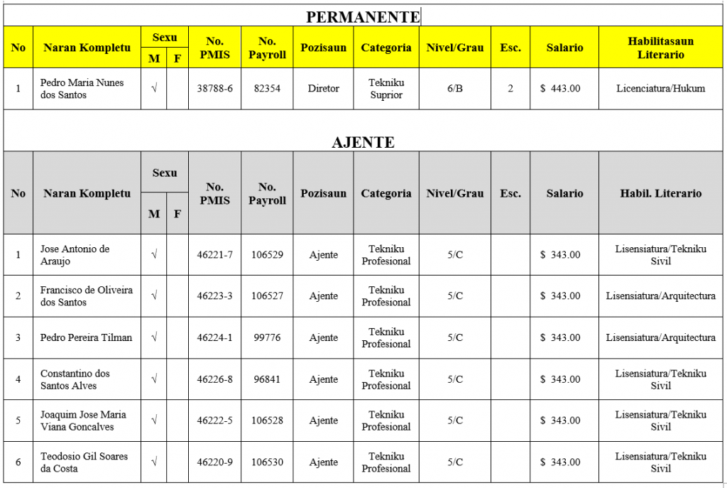TAREFA SERVISU DIRETOR,OFISIAL FINANSAS,OFISIAL ADMINISTRASAUN,TEKNIKU ARQUITECTURA NO TEKNIKU SIVIL