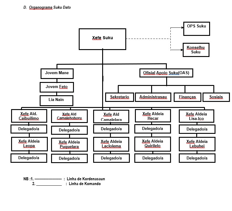 Estrutura suku, lidera husi ema koletiva husi direitu publiku ho natureza assosiativa ne’ebé eleitu husi povu no hetan lijitimidade husi povu no hamutuk ho komunidade hodi dezenvolve suku no harií sosiedade ida hodi lori moris ida dignu, inkluzivu no sustentanvel.